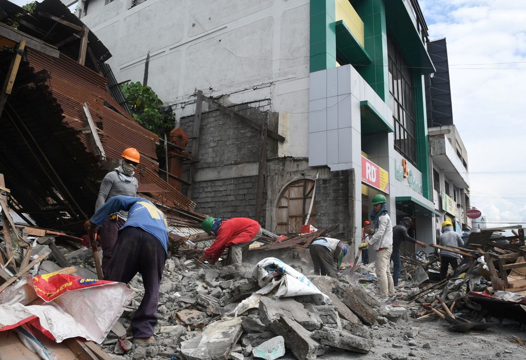 Workers remove debris from a collapsed house after a 6.8-magnitude earthquake hit General Santos City, in southern island of Mindanao on April 29, 2017. AFP / EDWIN ESPEJO