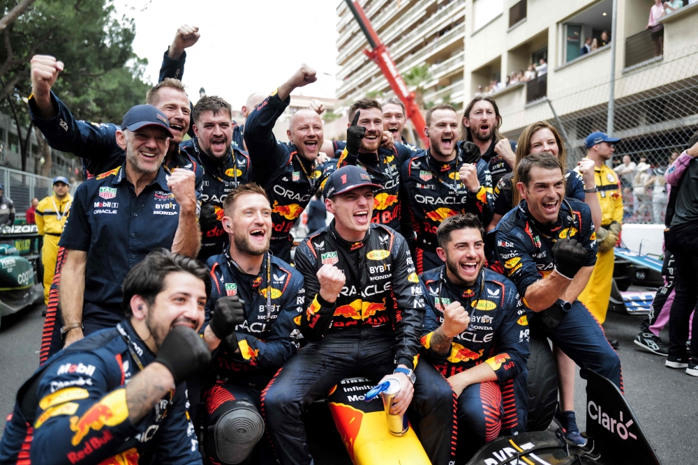 Red Bull Racing's Dutch driver Max Verstappen (C) celebrates with team members in the parc ferme after winning the Formula One Monaco Grand Prix at the Monaco street circuit in Monaco, on May 28, 2023. Photo by OLIVIER CHASSIGNOLE / AFP