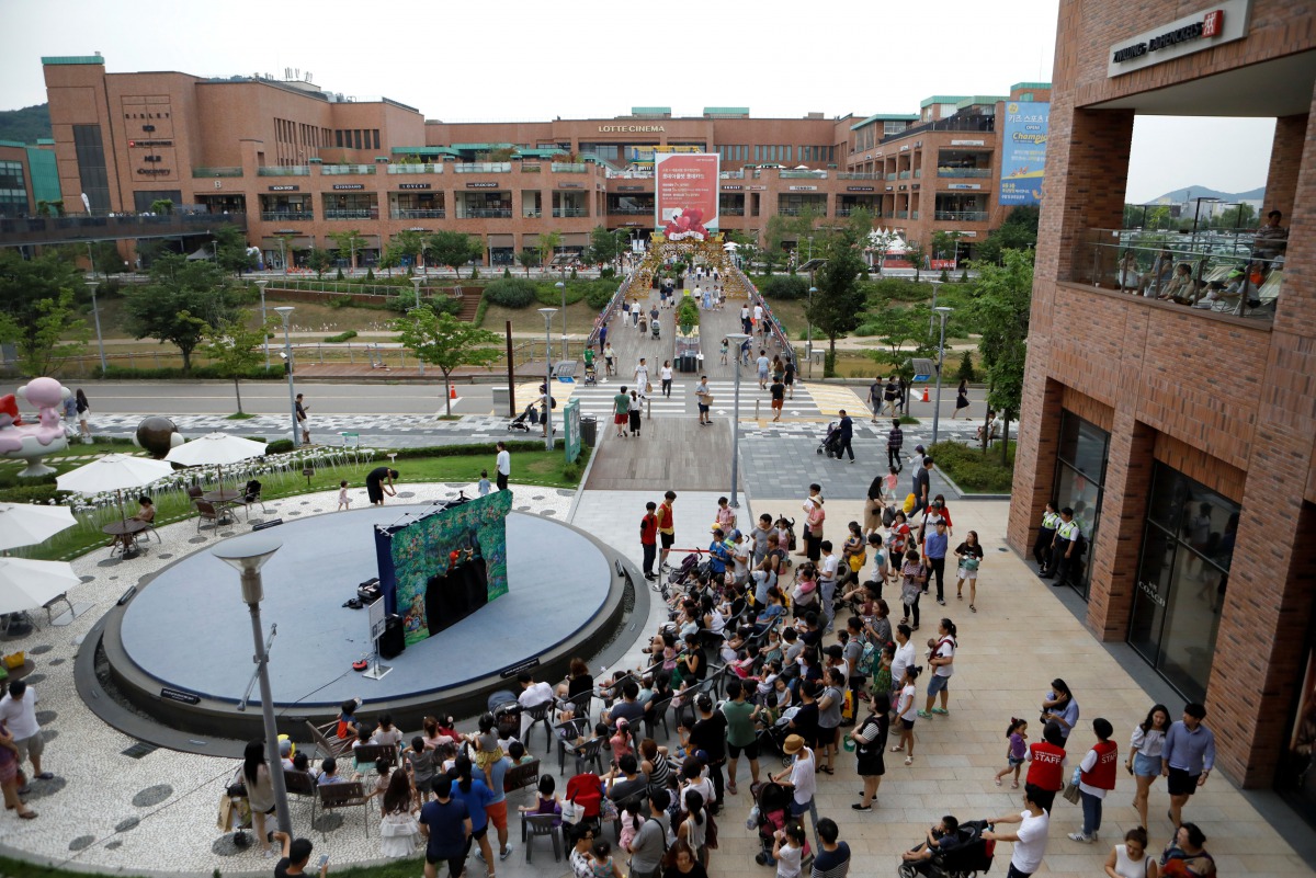 At Shinsegae Paju Premium Outlet, about a dozen children jump and scream around a fountain inside the mall on a sizzling, July summer day. Just a couple miles away is a village modelled after France’s tourism centre of Provence, where restaurants, bakeries and clothing shops are decorated like a children’s playbook.