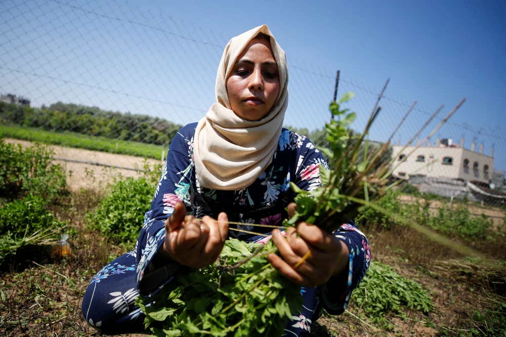 A Palestinian woman collects mint in her family land, in Beit Lahiya town in the northern Gaza Strip July 28, 2021. Reuters/Mohammed Salem