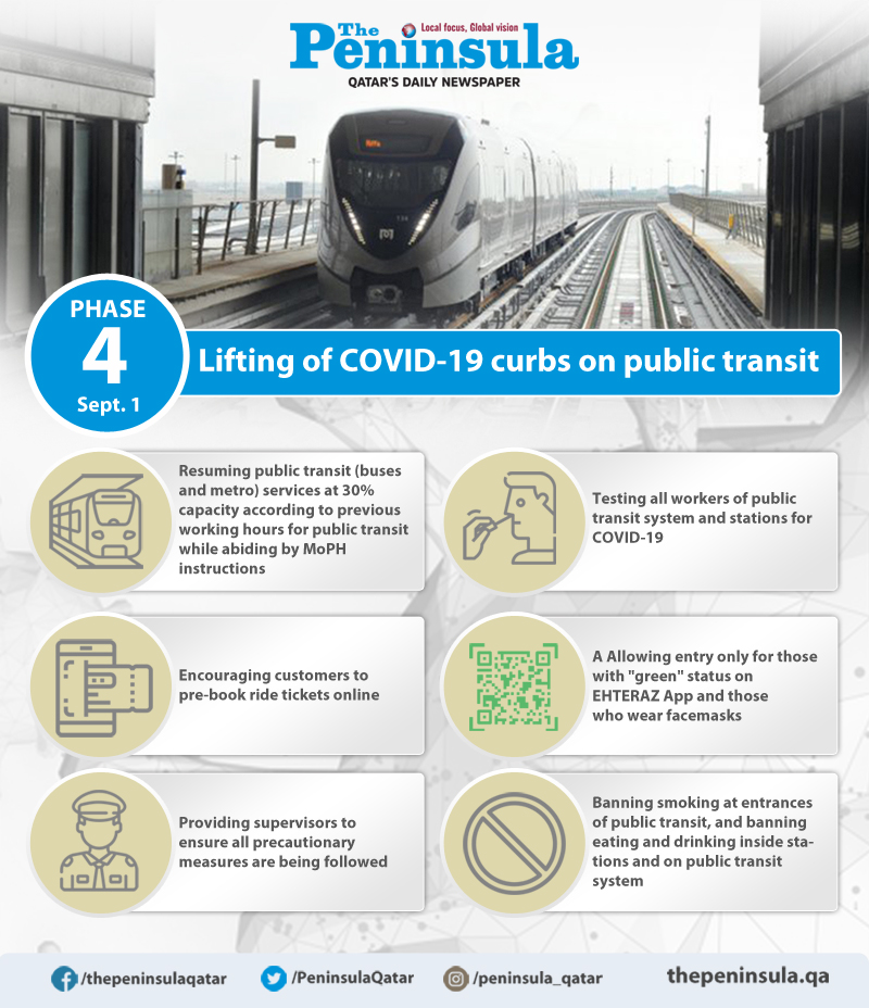 Doha: Ministry of Transport and Communication (MOTC) announced that public transit (buses and metro) services will resume at 30% capacity as of Tuesday, September 1 as Phase 4 of gradual lifting of COVID-19 curbs on public transit system begins.