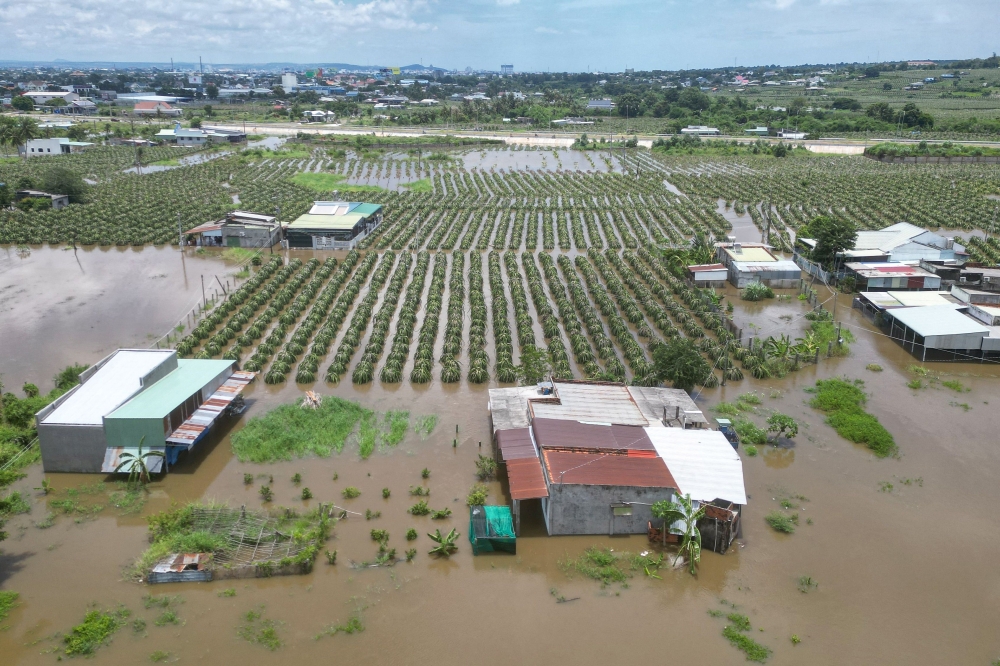 This aerial photo taken on August 28, 2024 shows a flooded dragon fruit farm in Binh Thuan province. Photo by Thanh LONG / AFP