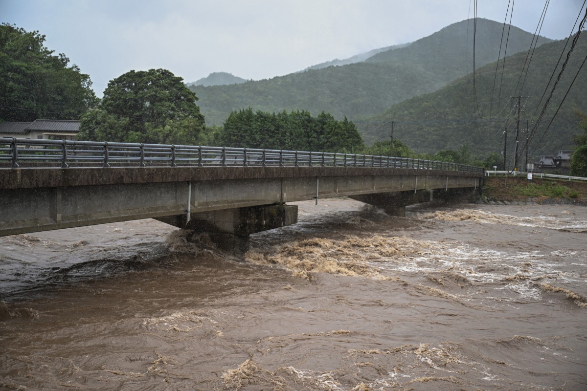 A general view shows the swollen Tsubusa river due to heavy rain brought by Typhoon Shanshan in Usa, Oita prefecture on August 29, 2024. Photo by Yuichi YAMAZAKI / AFP​​​​​​​