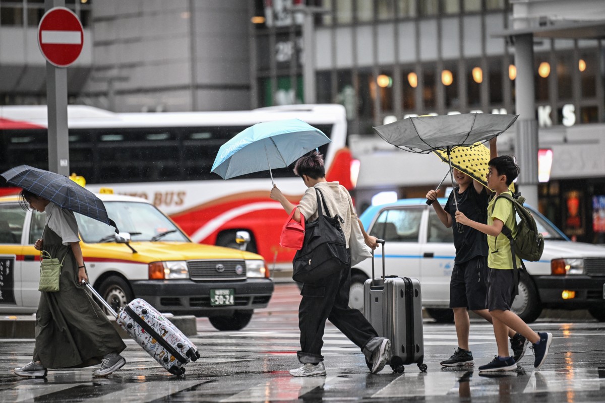 People hold umbrellas as they cross a street outside Hakata station in Fukuoka, Japan, on August 29, 2024. Photo by Yuichi YAMAZAKI / AFP