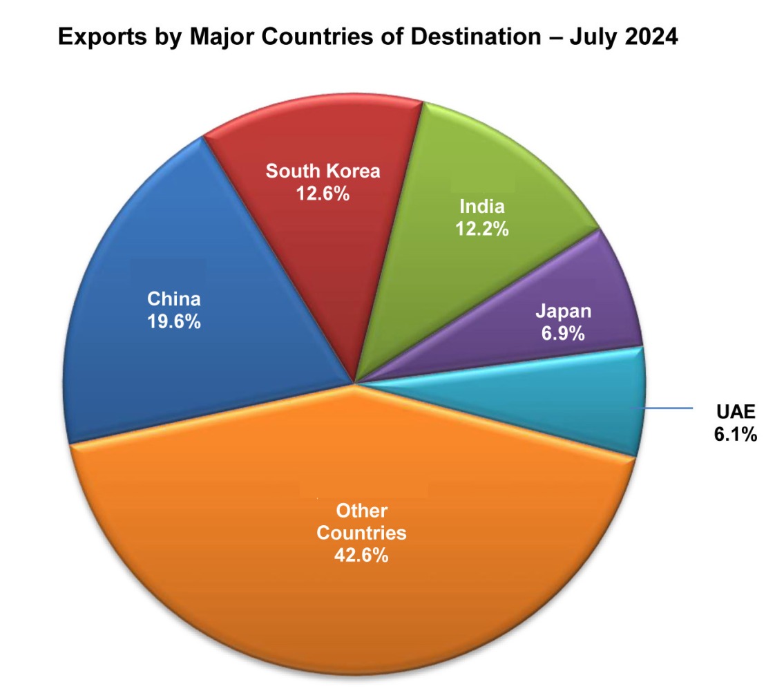 In July 2024, China was at the top of the countries of destination of Qatar’s exports with close to QR5.9bn, a share of 19.6 percent of total exports, followed by South Korea with almost QR3.8bn and a share of 12.6 percent, and India with about QR3.7bn, a share of 12.2 percent.