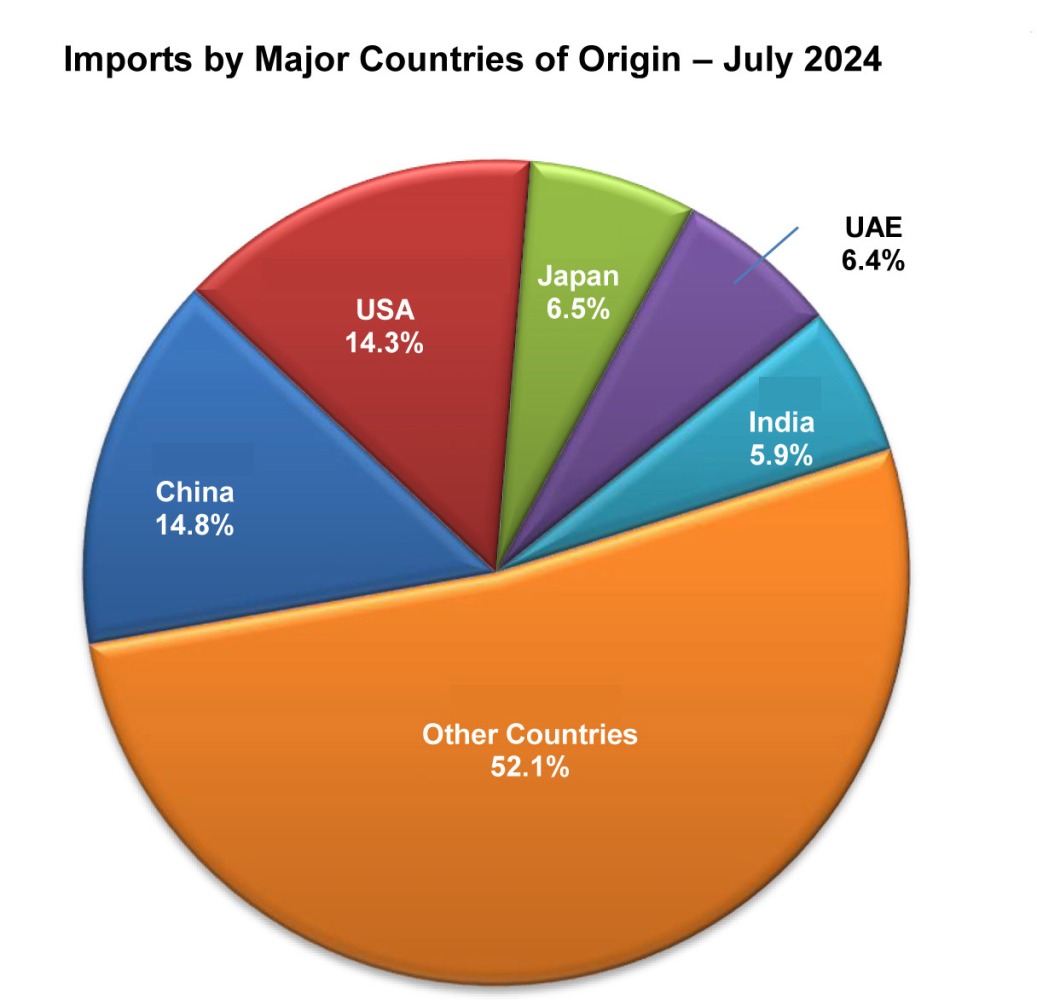 In July 2024, China was the leading country of origin of Qatar’s imports with about QR1.5bn, a share of 14.8 percent of the imports, followed by United States of America with QR1.4bn almost, a share of 14.3 percent, and Japan with QR0.7bn, a share of 6.5 percent.