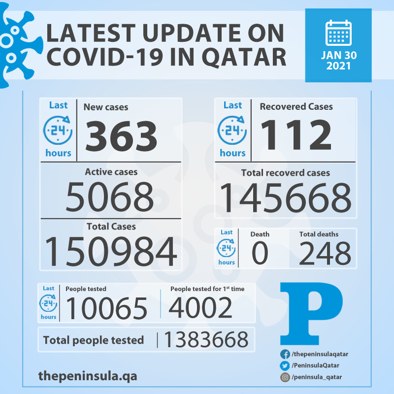 Doha: Ministry of Public Health (MoPH) today reported 363 new cases of coronavirus (Coivd-19) and 112 people recovered from the virus in the last 24 hours, bringing the total number of people recovered in Qatar to 145,668.