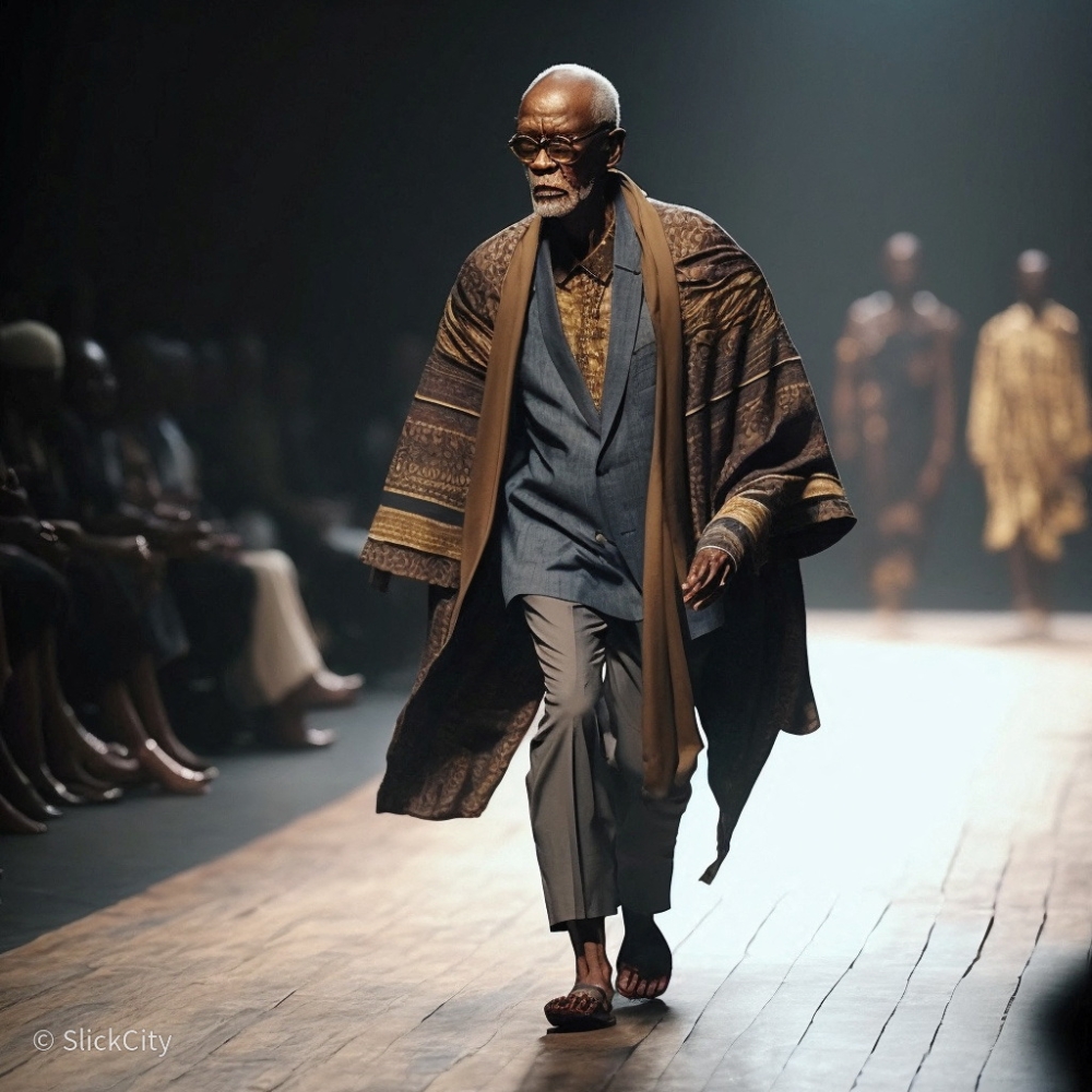 An undated handout picture by Nigerian artist Malik Afegbua, created with the use of Artificial Intelligence (AI), shows an elderly model walking on a runway, as part of his Elder series. Courtesy of Malik Afegbua/Handout via REUTERS