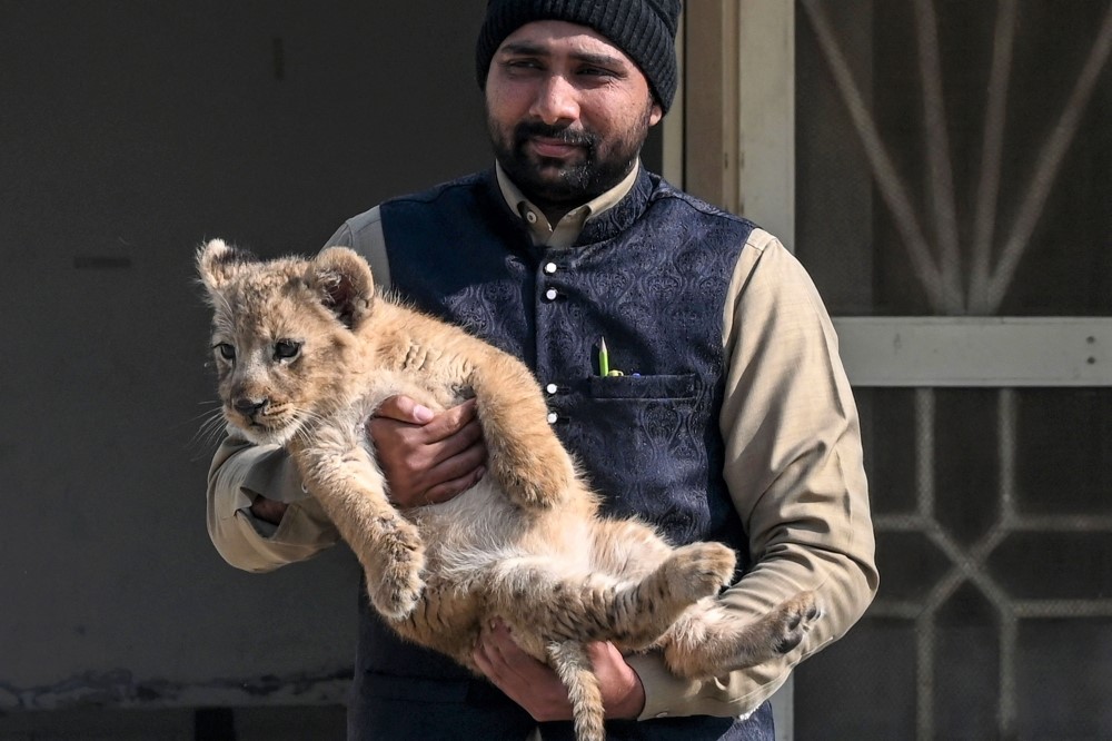 Pakistani zookeeper Mohammad Amir, holds a lion cub confiscated from YouTuber Rajab Butt, at a safari zoo in Lahore on January 28, 2025. (Photo by Arif Ali / AFP)