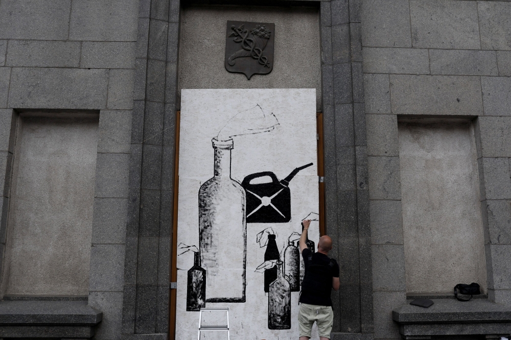 The three-meter-high (10ft) painting of a gasoline canister and bottles with rags stuffed in their necks memorializes the petrol bombs made by civilians to help thwart Russia’s onslaughts on Kharkiv and Kyiv in February.