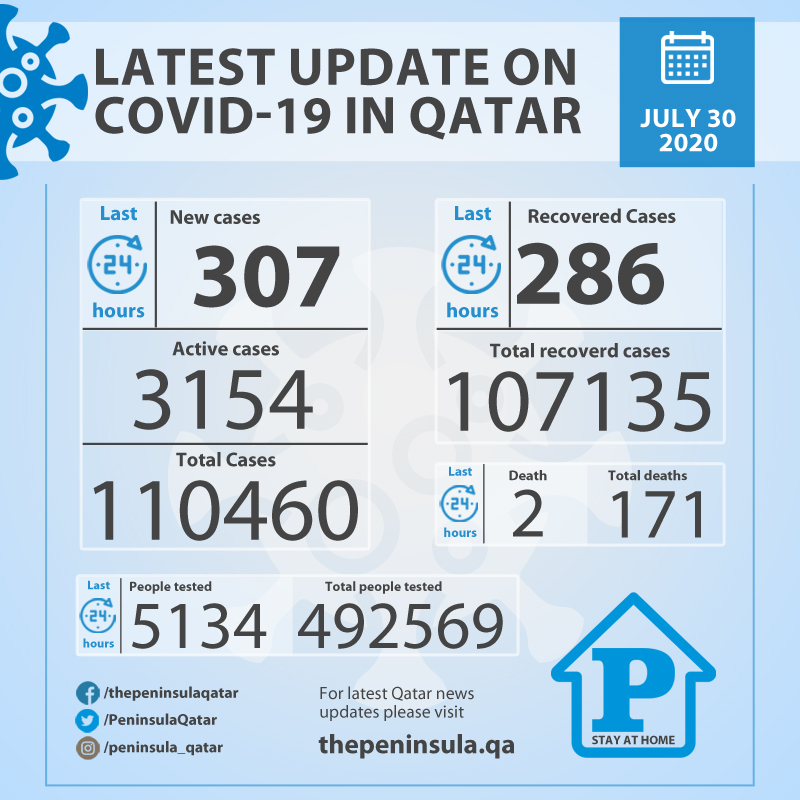Ministry of Public Health today recorded 307 new cases of coronavirus (COVID-19) and 286 people recovered from the virus in the last 24 hours, bringing the total number of people recovered in Qatar to 107,135. The Ministry also announced two deaths due to Covid-19.