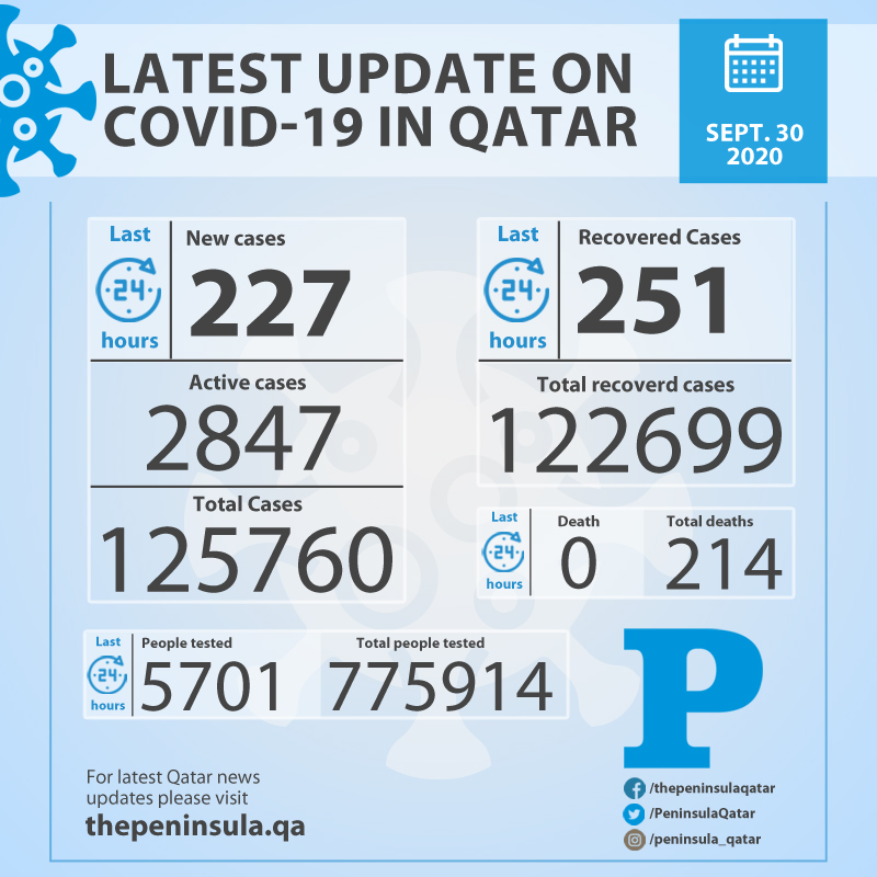 Doha: Ministry of Public Health (MoPH) today recorded 227 new cases of coronavirus (COVID-19) and 251 people recovered from the virus in the last 24 hours, bringing the total number of people recovered in Qatar to 122,699.