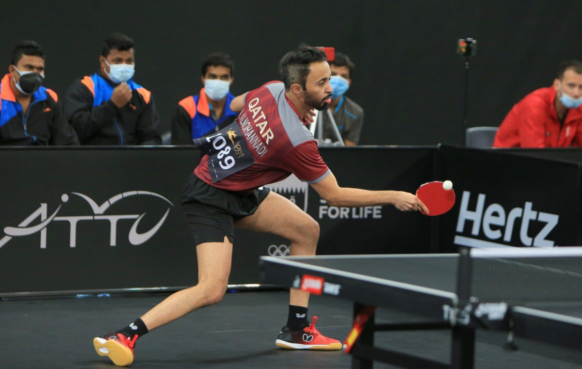 Qatar's Ahmad Khalil Al Mohannadi in action during his Asian Table Tennis Championships men's teams placement match against Sri lanka at the Lusail Sports Hall yesterday.