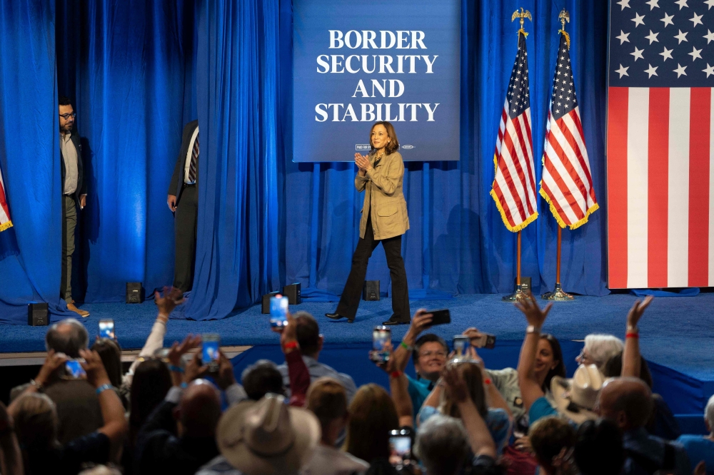 US Vice President and Democratic presidential candidate Kamala Harris claps as she leaves the stage after speaking during a campaign rally in Douglas, Arizona, on September 27, 2024. (Photo by Rebecca Noble / AFP)