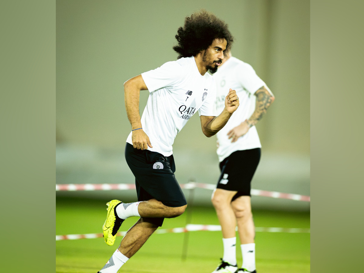 Al Sadd's Akram Afif trains with teammates.