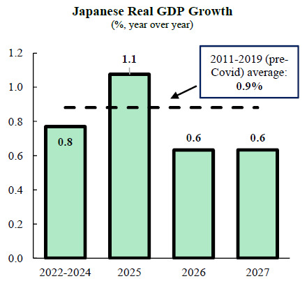 Japan’s economic performance has been underwhelming in recent years. After the post-Covid pandemic rebound, annual real GDP growth fluctuated around 0.8% during 2022-2024.