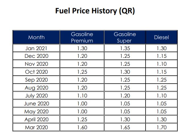 In April 2016, the Ministry of Energy and Industry had started pegging the fuel prices to the international market and from September 2017, it is Qatar Petroleum who is announcing the monthly price list.