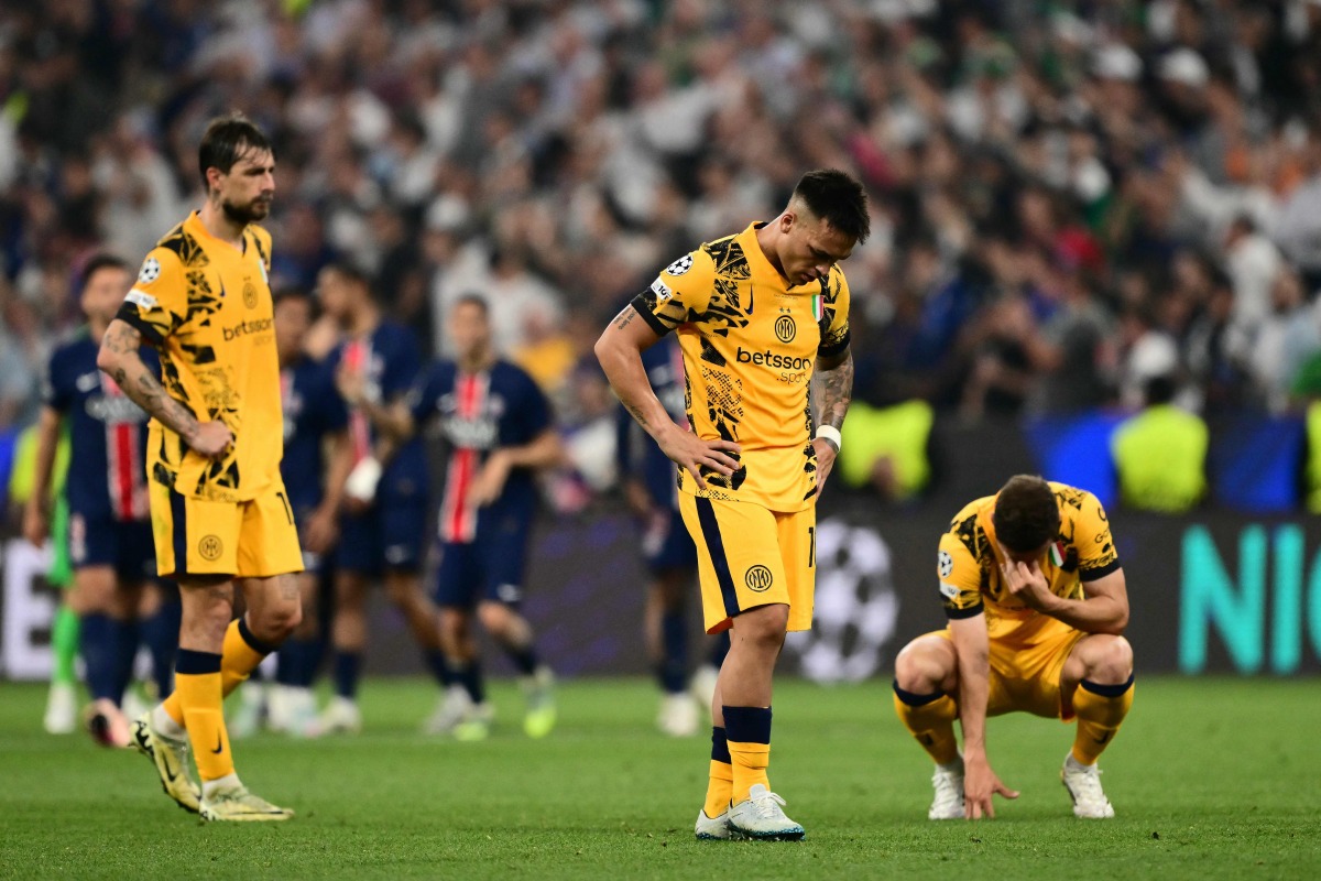 Inter Milan's Argentine forward #10 Lautaro Martinez (C) reacts during the UEFA Champions League final football match between Paris Saint-Germain (PSG) and Inter Milan in Munich, southern Germany on May 31, 2025. (Photo by Marco BERTORELLO / AFP)