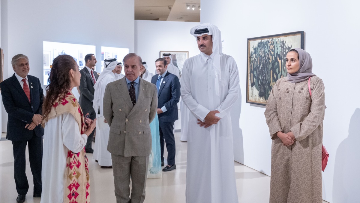 Doha, Qatar: The Amir His Highness Sheikh Tamim bin Hamad Al Thani and His Excellency Muhammad Shahbaz Sharif, Prime Minister of the Islamic Republic of Pakistan, today visited the exhibition “Art and Architecture in Pakistan from the 1940s to the Present” at the National Museum of Qatar.