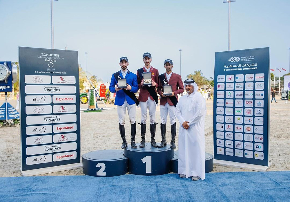 Longines Hathab Qatar Equestrian Tour Organising Committee Vice Chairman Ali bin Youssef Al Rumaihi with the Big Tour podium winners.