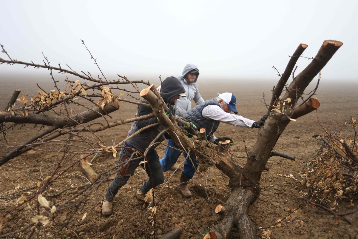 Two undocumented workers from Honduras and a supervisor clear dead almond trees at Del Bosque Farms in Firebaugh, California, on December 17, 2024. (Photo by David Swanson / AFP)