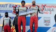 Navigator Nasser Saadoun Al Kuwari of Qatar (left) and Kuwaiti driver Meshary Al Dhafiri celebrate on the podium after winning the second round...