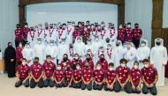 The players and officials of Team Qatar pose for a photograph with Khalil Ahmad Al Mohannadi, President of the Arab Table Tennis Federation...