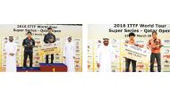 Vladimir Samsonov of Belarus (second right) poses with the men’s singles trophy of the GAC Group 2015 ITTF World Tour Qatar Open along...