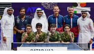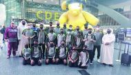 Qatar U-13 team members and officials pose for a photograph after being crowned champions in their age group at the Arab Table Tennis...